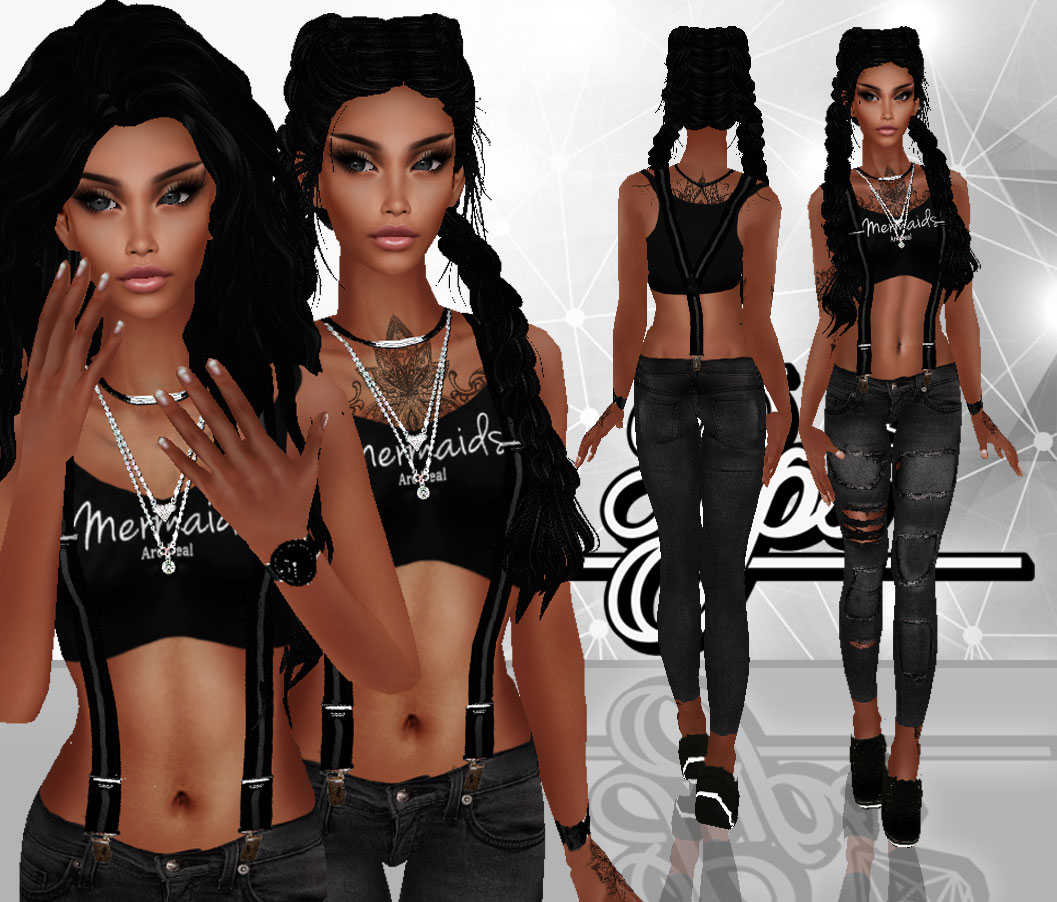 джинсы и подтяжки (в.о.) + топ, часы< цепочка (н.б.) + обувь